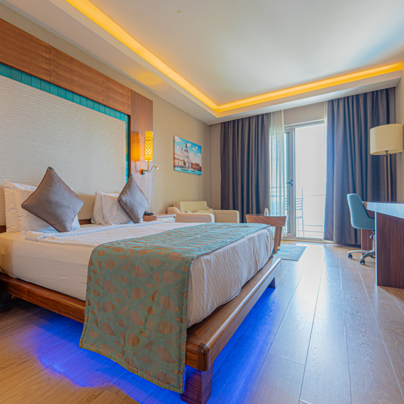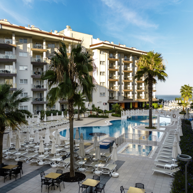 Votre hôtel Le Ramada Hotel & Suite 4* construit en 2018, est un magnifique complexe à l’architecture moderne et s’étendant sur une superficie de près de 20 000 m². Il dispose de 270 chambres, réparties sur 4 bâtiments de 6 étages. La plage se trouve à 2,5 km et une navette est mise à disposition pour s’y rendre. À votre disposition : Réception 24h/24, location de voiture*, blanchisserie*, room service*, boutiques, médecin*, coiffeur*, parasols, transats, wifi, navette gratuite pour la plage (du 01/05 au 31/10).*Avec supplémentLes animaux ne sont pas admis dans l’hôtel Votre chambre Pour rendre votre séjour agréable, vous serez logé en chambre supérieure d’environ 34 m², disposant toutes d’un grand lit ou deux lits simples. La capacité maximale d'accueil en chambre est de 2 adultes + 1 enfant + 1 bébé. La chambre dispose des équipements suivants : écran de télévision satellite LCD, balcon, air conditionné, téléphone*, coffre-fort, mini bar, salle de bains avec douche et sèche-cheveux, wifi, thé/café.*Avec supplémentDans le cadre d'une chambre à usage triple ou quadruple, vous serez logé en chambre double équipée d'un lit double (ou de 2 lits twins) et de 1 ou 2 lits d'appoint (sofa, canapé lit). Restaurants et bars Pour un séjour sans soucis, vous bénéficierez de la formule tout inclus, qui comprend aussi bien les repas, boissons locales et snacks. Les repas seront servis sous forme de buffet, au restaurant principal de l’hôtel ou vous pourrez déguster de délicieuses spécialités locales et internationales. Votre formule tout inclus comprend : Petit-déjeuner : de 7h00 à 10h00Petit-déjeuner tardif : de 10h00 à 10h30Déjeuner : de 12h30 à 14h00Beach snack : de 12h30 à 17h30 (du 01/05 au 31/10)Pâtisserie : de 12h30 à 18h00Glaces : de 14h00 à 17h00Dîner : de 19h00 à 21h00Soupe de nuit : de 23h00 à minuit L’hôtel possède également 3 restaurants à la carte (sur réservation du 01/05 au 31/10, gratuit une fois par séjour) :Dionysos Turkish Cuisine : de 19h30 à 21h30Dionysos Italian Cuisine : de 19h30 à 21h30Dionysos Sea Food : de 19h30 à 21h30À votre disposition également pour vous rafraîchir 4 bars :Liberty Lobby Bar : de 10h00 à minuitSunset Bar : de 10h00 à minuitAqua Bar : de 10h00 à 17h00Beach Bar : de 10h00 à 17h00*Avec supplémentÀ noter que la formule tout inclus comprend les boissons de 10h00 à minuit. Les horaires sont donnés à titre indicatif et peuvent être soumis à modification sans préavis. Les jus de fruits frais, les boissons importées, les cocktails mais aussi les boissons en bouteilles ne sont pas compris. Vos activités et loisirs Deux piscines principales et une piscine pour enfant seront à votre disposition ainsi que des toboggans (de 10h30 à 12h30 et de 14h00 à 17h00). Une animation légère en journée et différentes activités vous seront proposées parmi lesquelles : tennis de table, fléchettes, step aérobics, jeux de piscines, karaoké, golf*, billards*, jeux d’arcades, spa (sauna, bain turc, salle de fitness, massages* et soins*), animations de jour et de nuit, spectacle, mini club (de 4 à 12 ans), mini disco (de 21h00 à 21h30).Pour les enfants : un mini club est disponible pour les enfants âgées de 4 à 12 ans de 10h00 à 12h30 et de 14h30 à 17h30. Mini disco de 21h00 à 21h30. *Avec supplémentÀ noter qu’au vu de la météo, certains équipements extérieurs peuvent ne pas être praticables et certaines activités annulées. Les activités, sports et soirées sont encadrées par une équipe d’animation internationale. Locate Situation L’hôtel se trouve à 2 km du centre-ville de Kusadasi et à 70 km de l’aéroport d’Izmir. La plage se trouve à 2 km.