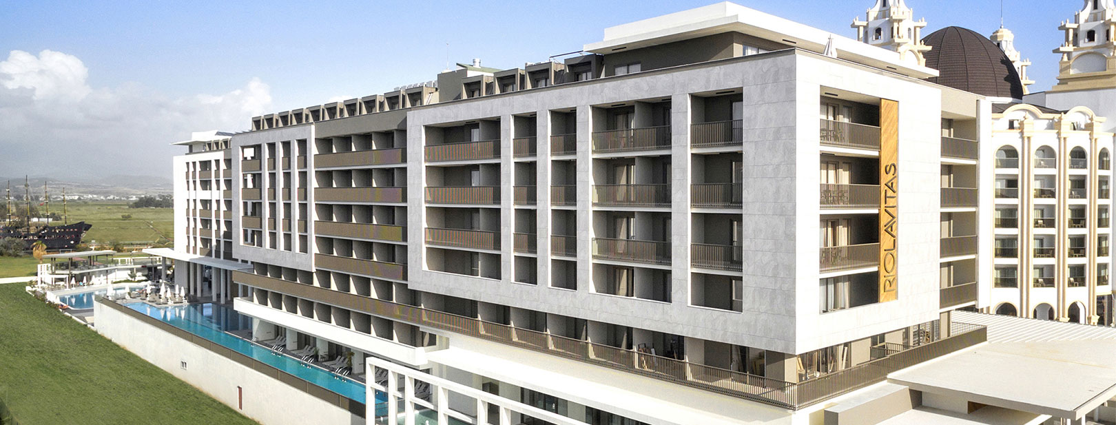 Ouvert en 2016, le Riolavitas 5* est un complexe de 362 chambres réparties dans un bâtiment principal de 8 étages et étendu sur une surface de 17 000m². Vous pourrez rejoindre aisément la plage privée de l’hôtel située à 300 mètres et parcourir les trésors de la ville antique de Side à 8 km. Outre son emplacement stratégique pour de belles découvertes, vous apprécierez la diversité de ses loisirs, du spa aux différentes piscines en passant par les nombreuses activités. À votre disposition : wifi, boutiques*, coiffeur*, salon de beauté*, location de voitures et vélos*, service médical* (sur demande), blanchisserie/nettoyage à sec*, coffre dans la chambre*, babysitting* (sur demande), photographe*, navettes gratuites pour la plage (9h00 – 18h00), transats et parasols.
