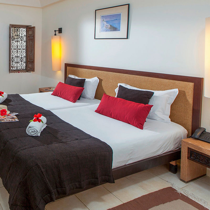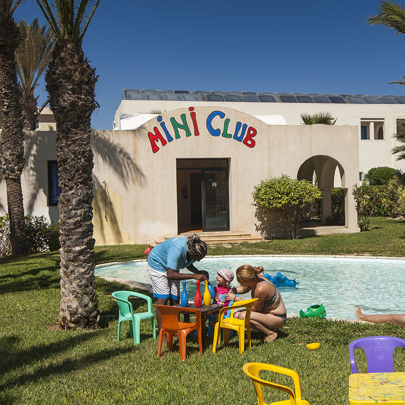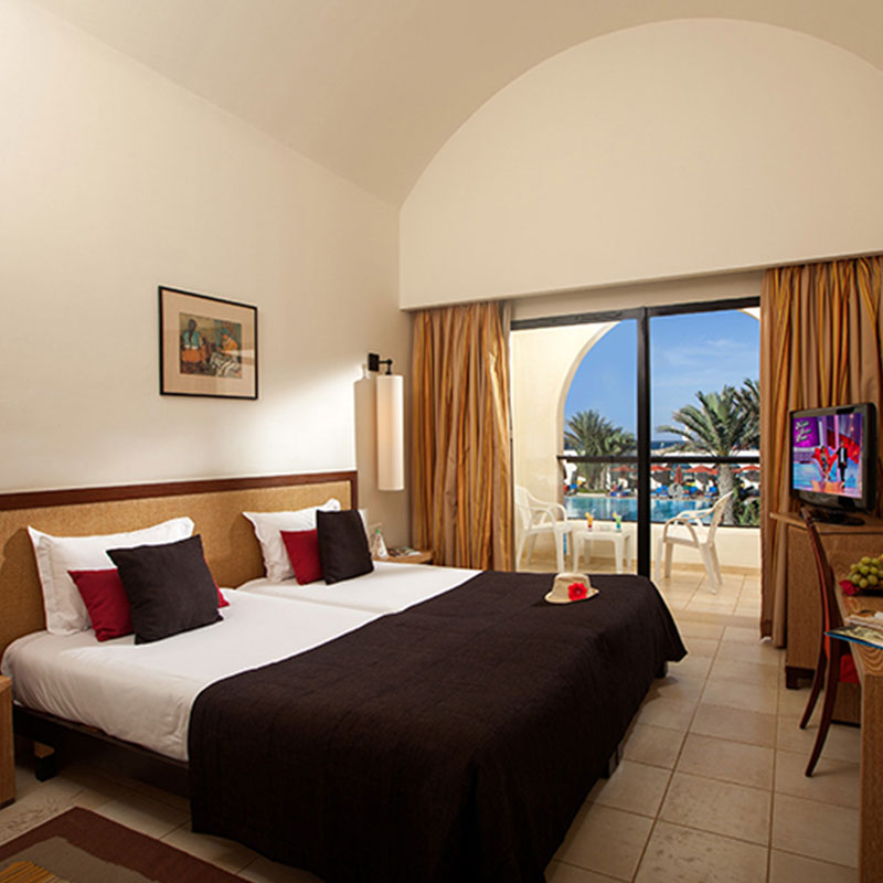 Votre hôtel Cet élégant hôtel de bord de mer à l'ambiance familiale et au service attentionné est niché dans de vastes jardins paysagers. Il compte 248 chambres réparties sur 2 étages. De style typiquement djerbien, le bâtiment construit en forme de 'U' entoure une cour intérieure avec une magnifique piscine. Éco-responsable, l’hôtel pratique le tri sélectif et exploite l’énergie solaire. À disposition : wifi dans les parties communes, réception 24h/24, parking, salon de coiffure*, blanchisserie*, boutiques*.* Avec supplément Votre chambre Vous serez logés en chambre standard d’environ 30m², elles peuvent accueillir jusqu’à 3 personnes. Vastes et confortables, elles sont toutes équipées de : terrasse ou balcon, climatisation (du 15/06 au 15/10), chauffage (selon conditions climatiques), télévision par satellite, téléphone, coffre-fort*, wifi, mini-frigo rempli*, salle de bain avec douche et sèche-cheveux.Moyennant un supplément tarifaire, vous pourrez séjourner dans une chambre vue piscine (2 adultes maximum), vue mer partielle (2 personnes maximum) ou chambre familiale (3 adultes et 1 enfant maximum).Dans le cas d'une chambre à usage triple ou quadruple, l'hôtel met à disposition des clients une chambre double équipée d'un lit double (ou de 2 lits) et d’un ou deux lits d'appoints (sofa, canapé lit). Restaurants et bars Séjournez l’esprit libre avec la formule « tout inclus », qui comprend aussi bien les repas servis sous forme de buffet au restaurant principal de l’hôtel "El Kastil", où vous découvrirez des saveurs locales et internationales, que les boissons locales, alcoolisées ou non.Votre formule "tout inclus" comprend :Petit déjeuner : 7h00-10h00Petit déjeuner tardif au Beach bar: 10h00-12h00Déjeuner : 12h30-14h30Dîner : 19h00-21h30Snacks: 15h00-17h30Envie de goûter à d’autres saveurs ? Vous aurez également la possibilité de prendre vos repas dans le restaurant à la carte* de l’hôtel « El Mahboubine » (1 fois par séjour). Plusieurs bars seront également à votre disposition :Lobby bar : 09h00 à minuitBeach bar: 10h00 à minuit (ouvert selon conditions météo)Moorish café : 16h00 à 00h00*Avec supplémentÀ noter que la formule tout inclus comprend les boissons de 10h00 à minuit (servies au verre). Les horaires sont donnés à titre indicatif et peuvent être soumis à modification sans préavis. Les jus de fruits frais, les boissons importées, les cocktails, le narguilé mais aussi les boissons en bouteilles ne sont pas compris. Les horaires ci-dessous sont indiqués à titre indicatif, et sous réserve de modification par l’hôtelier ou selon les conditions climatiques et/ou de saisonnalité. Vos activités et loisirs Les animateurs francophones, parfaitement intégrés à l’équipe d’animation internationale de l’hôtel, vous proposeront des activités sportives et ludiques en journée ainsi que des animations nocturnes. À votre disposition : 1 piscine couverte (chauffée en du 01/11 au 15/03), 1 piscine extérieure, 1 piscine pour enfants, aérobic, aquagym, beach volley, fléchettes, tennis de table, water-polo, pétanque, tir à l’arc, 2 courts de tennis (1h par jour sur réservation, éclairage payant), salle de remise en forme (avec réservation), billard*, plongée*, sports nautiques* (ski nautique, parachute, banana boat), quads*, équitation*, golf à 2 km*.*Avec supplémentPlongez dans l’oasis de bien-être de l’hôtel Djerba Beach qui vous propose de vous relaxer dans le hammam*, le sauna* ou bénéficier d’un massage* bienfaisant. Pour les enfants : un mini-club de 4 à 12 ans (de 10 h à 12 h et de 15 h à 17 h) comblera les attentes de vos enfants, avec un programme d’animation adapté à leur âge.À noter qu’au vu de la météo, certains équipements extérieurs peuvent ne pas être praticables et certaines activités annulées. Les activités, les sports et les soirées sont encadrés par une équipe d’animation internationale. Locate Situation Le Djerba Beach se trouve au bord d’une plage en pente douce de la belle île de Djerba en Tunisie, à seulement 10 km du lieu de villégiature de Midoun, de ses oliveraies et palmeraies. La ville principale de l’ile, Houmt Souk est à 15 km et l’aéroport de Djerba-Zarzis est distant d’environ 25 km.