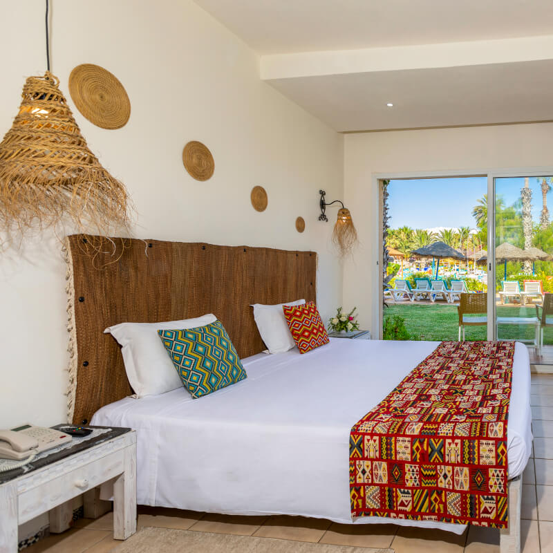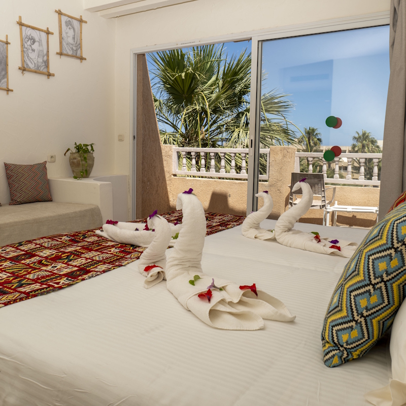 Pour un séjour sous le signe du confort, vous serez logé en chambre standard avec balcon ou terrasse. La chambre est dotée d’un grand lit ou de 2 lits simples. La capacité maximale d’accueil en chambre est de 4 personnes (2 adultes et 2 enfants). Elle est équipée de : balcon ou terrasse, chauffage (du 15/12 au 15/02), climatisation (du 15/06 au 15/09), wifi, mini-frigo, coffre-fort* (5 dt par jour), télévision par satellite, téléphone*, salle de bains équipée avec douche ou baignoire et sèche-cheveux.